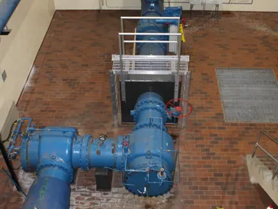 The raw water entering the plant inlet first passes through a raw water isolation valve and then through the raw water pressure reducing valve which lowers the incoming water pressure to 125 kPa. Under normal operations, water then flows thorough the intake energy recovery turbine system and into the low lift well.
