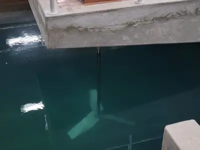 Water from the low-lift pumps flows into four flocculation tanks. The flocculation tanks provide retention time to allow floc particles to develop. Each of the flocculation tanks is equipped with a variable speed mixer, which slowly stirs the water to aid in the formation of floc particles. Manual gate valves located at the inlet and outlet of each flocculation tank allow for the tanks to be operated as four individual tanks in parallel or as a pair of tanks in parallel, each with two cells in series. Water exiting the flocculation tanks flows into the filter inlet trough.