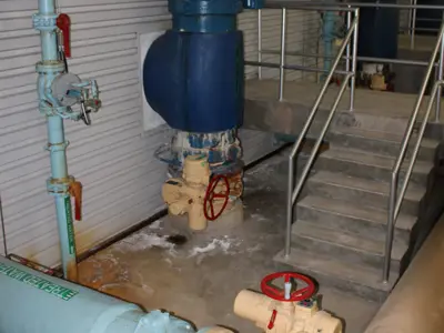 Two low-lift well cells contain four low-lift pumps, two in each cell. The low-lift pumps serve to pump water from the low-lift well to the flocculation tanks. Each low lift pump is equipped with a pressure relief valve, which serves to relieve excess discharge pressure back to the low lift well. The discharge pipe for each low lift pump is also equipped with an inline blender, which allows for thorough mixing of the aluminum sulfate which is added to the discharge flow of each pump. The discharge flow from the low lift pumps flows through a common discharge header, then through the raw water flow control valve, and finally, onto the flocculation tanks. The raw water flow control valve varies the flow into the flocculation tanks to maintain a constant level in the filter inlet trough.