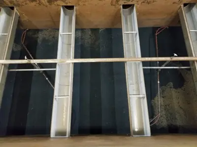 The filter inlet trough feeds all four filters. The water slowly enters each filter through its dedicated inlet valve and flows down through the filter media (anthracite and sand), then out through the filtrate valve. Filtered water then flows from the filters into the chlorine contact chamber, where post-chlorination takes place, and then on to the clearwells.