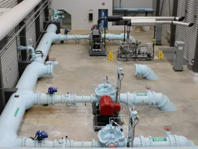 Surge tanks are connected to the west end of the high lift discharge header to buffer the water surge from high lift pump operation.